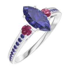 Inel Aur alb 9 carate - Safir albastru Marquise 0.5 carate - Pietre laterale Rubin - Încrustare Safir albastru