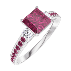 Inel Aur alb 9 carate - Rubin Princess 0.7 carate - Pietre laterale Diamant - Încrustare Rubin