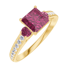 Inel Aur galben 9 carate - Rubin Princess 0.7 carate - Pietre laterale Rubin - Încrustare Diamant