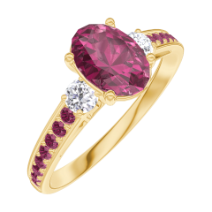 Inel Aur galben 18 carate - Rubin Oval 0.7 carate - Pietre laterale Diamant - Încrustare Rubin