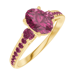 Inel Aur galben 18 carate - Rubin Oval 0.7 carate - Pietre laterale Rubin - Încrustare Rubin
