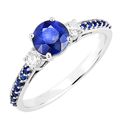 Inel Aur alb 9 carate - Safir albastru rotund 0.7 carate - Pietre laterale Diamant - Încrustare Safir albastru