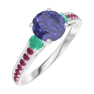 « L'ATELIER » Nº166092Inel Aur alb 9 carate - Safir albastru rotund 0.7 carate - Pietre laterale Smarald - Încrustare Rubin 5