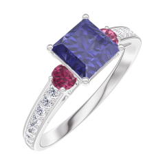 Inel Aur alb 18 carate - Safir albastru Princess 0.7 carate - Pietre laterale Rubin - Încrustare Diamant