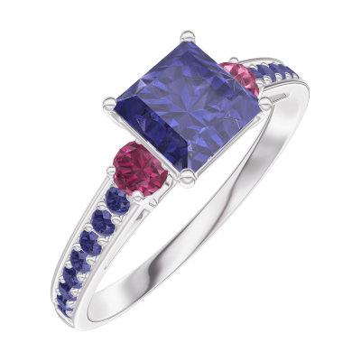 « L'ATELIER » NR. 166156Inel Aur alb 9 carate - Safir albastru Princess 0.7 carate - Pietre laterale Rubin - Încrustare Safir albastru