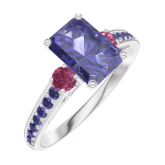 Inel Aur alb 9 carate - Safir albastru Smarald 0.7 carate - Pietre laterale Rubin - Încrustare Safir albastru