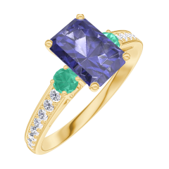 Inel Aur galben 18 carate - Safir albastru Smarald 0.7 carate - Pietre laterale Smarald - Încrustare Diamant
