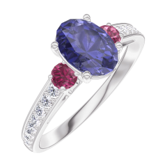 Inel Aur alb 9 carate - Safir albastru Oval 0.7 carate - Pietre laterale Rubin - Încrustare Diamant