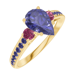 Inel Aur galben 9 carate - Safir albastru Pară 0.7 carate - Pietre laterale Rubin - Încrustare Safir albastru