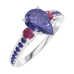 Inel Aur alb 9 carate - Safir albastru Pară 0.7 carate - Pietre laterale Rubin - Încrustare Safir albastru