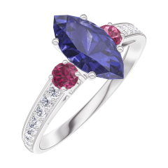 Inel Aur alb 9 carate - Safir albastru Marquise 0.7 carate - Pietre laterale Rubin - Încrustare Diamant