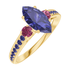 Inel Aur galben 9 carate - Safir albastru Marquise 0.7 carate - Pietre laterale Rubin - Încrustare Safir albastru