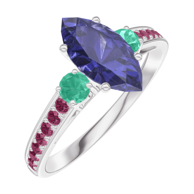 « L'ATELIER » NR. 166592Inel Aur alb 9 carate - Safir albastru Marquise 0.7 carate - Pietre laterale Smarald - Încrustare Rubin