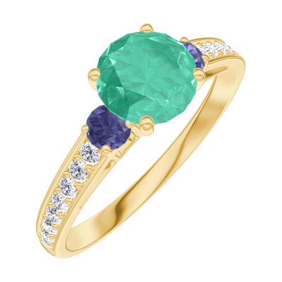 « L'ATELIER » NR. 166666Inel Aur galben 9 carate - Smarald rotund 0.7 carate - Pietre laterale Safir albastru - Încrustare Diamant 5