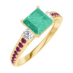 Inel Aur galben 18 carate - Smarald Princess 0.7 carate - Pietre laterale Diamant - Încrustare Rubin