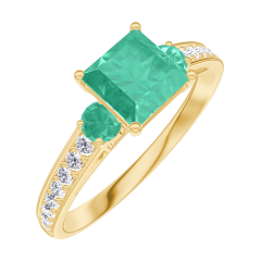 Inel Aur galben 9 carate - Smarald Princess 0.7 carate - Pietre laterale Smarald - Încrustare Diamant