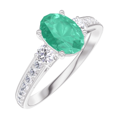 Inel Aur alb 9 carate - Smarald Oval 0.7 carate - Pietre laterale Diamant - Încrustare Diamant