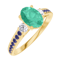 Inel Aur galben 9 carate - Smarald Oval 0.7 carate - Pietre laterale Diamant - Încrustare Safir albastru