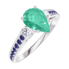 Inel Aur alb 9 carate - Smarald Pară 0.7 carate - Pietre laterale Diamant - Încrustare Safir albastru