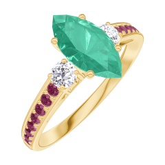 Inel Aur galben 9 carate - Smarald Marquise 0.7 carate - Pietre laterale Diamant - Încrustare Rubin