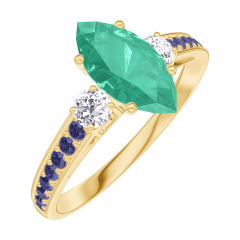Inel Aur galben 18 carate - Smarald Marquise 0.7 carate - Pietre laterale Diamant - Încrustare Safir albastru