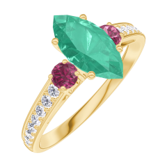 Inel Aur galben 9 carate - Smarald Marquise 0.7 carate - Pietre laterale Rubin - Încrustare Diamant