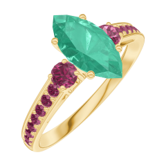 Inel Aur galben 18 carate - Smarald Marquise 0.7 carate - Pietre laterale Rubin - Încrustare Rubin