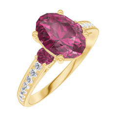 Inel Aur galben 9 carate - Rubin Oval 1 carate - Pietre laterale Rubin - Încrustare Diamant