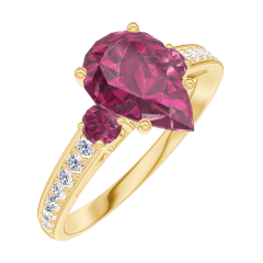 Inel Aur galben 18 carate - Rubin Pară 1 carate - Pietre laterale Rubin - Încrustare Diamant