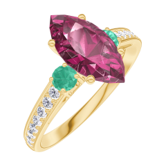 Inel Aur galben 18 carate - Rubin Marquise 1 carate - Pietre laterale Smarald - Încrustare Diamant