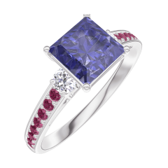 Inel Aur alb 9 carate - Safir albastru Princess 1 carate - Pietre laterale Diamant - Încrustare Rubin