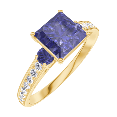 « L'ATELIER » NR. 168566Inel Aur galben 9 carate - Safir albastru Princess 1 carate - Pietre laterale Safir albastru - Încrustare Diamant