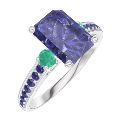 Inel Aur alb 9 carate - Safir albastru Smarald 1 carate - Pietre laterale Smarald - Încrustare Safir albastru