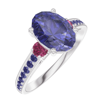 « L'ATELIER » NR. 168756Inel Aur alb 9 carate - Safir albastru Oval 1 carate - Pietre laterale Rubin - Încrustare Safir albastru 4.8