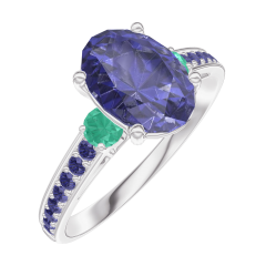 Inel Aur alb 18 carate - Safir albastru Oval 1 carate - Pietre laterale Smarald - Încrustare Safir albastru