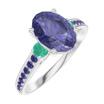 « L'ATELIER » NR. 168795Inel Aur alb 18 carate - Safir albastru Oval 1 carate - Pietre laterale Smarald - Încrustare Safir albastru 4.8