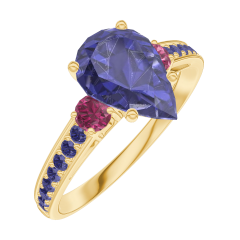 Inel Aur galben 18 carate - Safir albastru Pară 1 carate - Pietre laterale Rubin - Încrustare Safir albastru