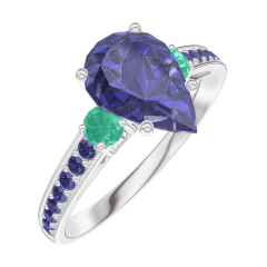 Inel Aur alb 18 carate - Safir albastru Pară 1 carate - Pietre laterale Smarald - Încrustare Safir albastru