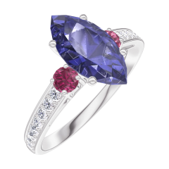Inel Aur alb 9 carate - Safir albastru Marquise 1 carate - Pietre laterale Rubin - Încrustare Diamant