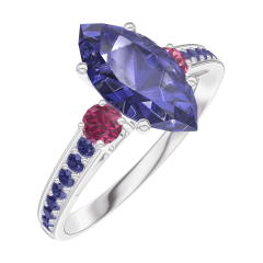 Inel Aur alb 9 carate - Safir albastru Marquise 1 carate - Pietre laterale Rubin - Încrustare Safir albastru