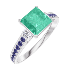 Inel Aur alb 9 carate - Smarald Princess 1 carate - Pietre laterale Diamant - Încrustare Safir albastru