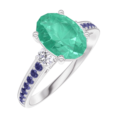 « L'ATELIER » NR. 169336Inel Aur alb 9 carate - Smarald Oval 1 carate - Pietre laterale Diamant - Încrustare Safir albastru 4.8