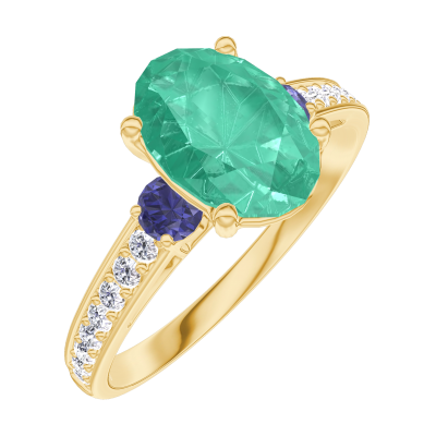« L'ATELIER » NR. 169365Inel Aur galben 18 carate - Smarald Oval 1 carate - Pietre laterale Safir albastru - Încrustare Diamant 4.8