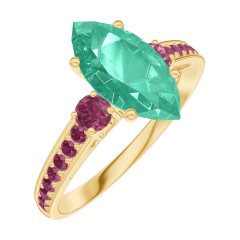 Inel Aur galben 18 carate - Smarald Marquise 1 carate - Pietre laterale Rubin - Încrustare Rubin