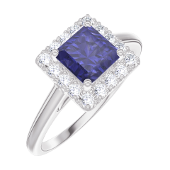 Inel Aur alb 18 carate - Safir albastru Princess 0.5 carate - Halo Diamant