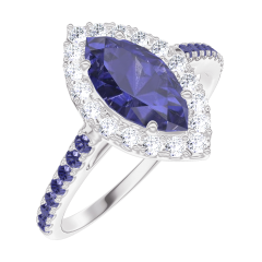 Inel Aur alb 9 carate - Safir albastru Marquise 0.5 carate - Halo Diamant - Încrustare Safir albastru
