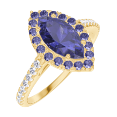 Inel Aur galben 9 carate - Safir albastru Marquise 0.5 carate - Halo Safir albastru - Încrustare Diamant