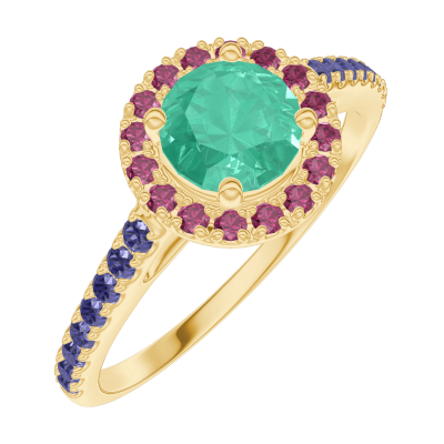 « L'ATELIER » Nº170893Inel Aur galben 18 carate - Smarald rotund 0.5 carate - Halo Rubin - Încrustare Safir albastru 5