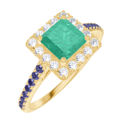 Inel Aur galben 18 carate - Smarald Princess 0.5 carate - Halo Diamant - Încrustare Safir albastru