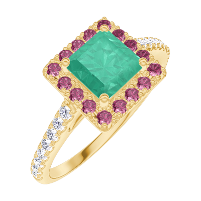 « L'ATELIER » NR. 170934Inel Aur galben 9 carate - Smarald Princess 0.5 carate - Halo Rubin - Încrustare Diamant 4.6